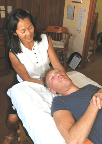 Arlen enjoying Zero Balancing. Ed and his "mum".